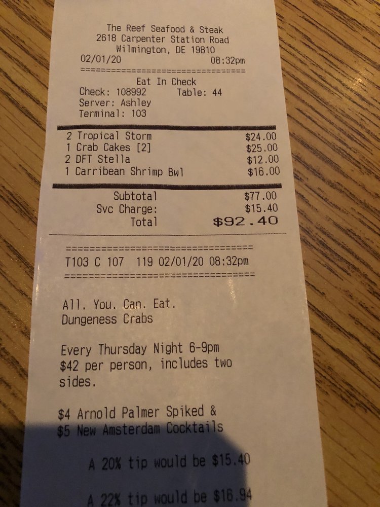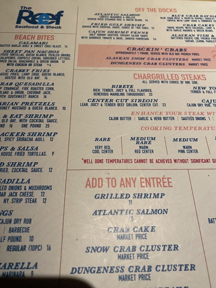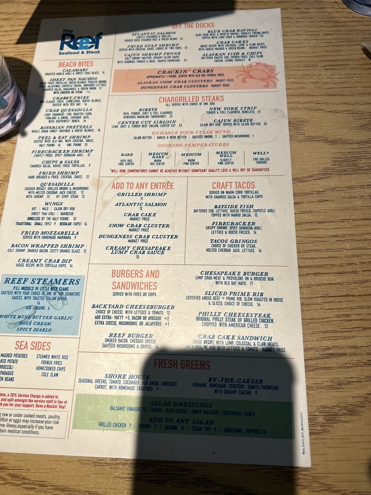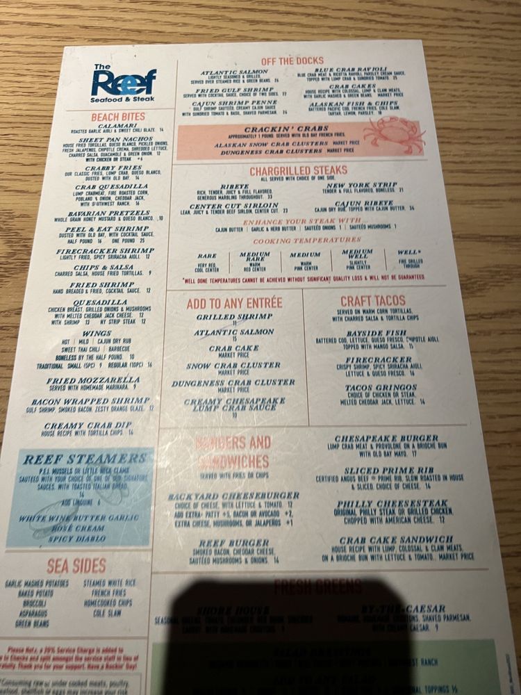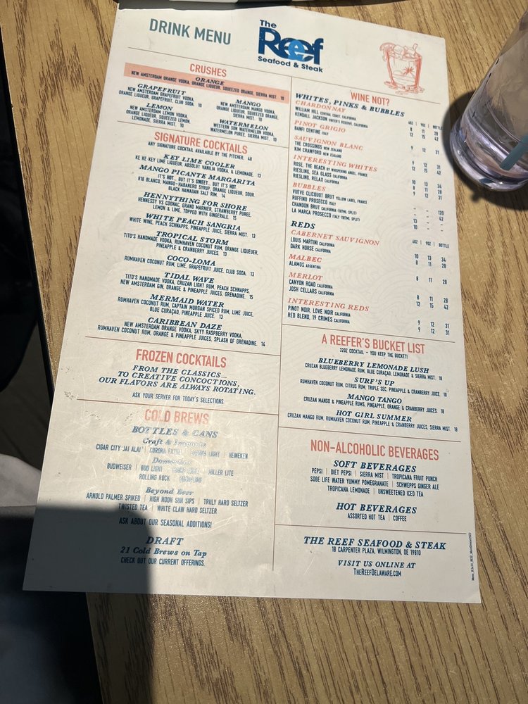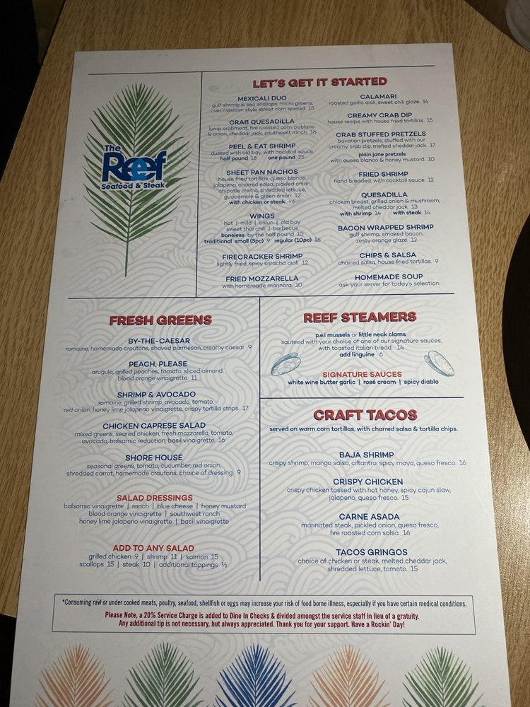 Located in Wilmington, DE, The Reef Seafood & Steak Restaurant offers a diverse menu catering to both seafood and steak lovers. With options for Keto and vegetarian preferences, the restaurant provides a casual dining experience with wheelchair accessibility, free Wi-Fi, and outdoor seating. The menu features a variety of starters, including steamed Gulf shrimp and chicken quesadillas. Their greens selection showcases salads like the Ahi Mango Tuna Salad and Caesar Salad. Homemade soups like French Onion are also available. Customer reviews rave about the great food, service, and live entertainment. Overall, The Reef provides a welcoming atmosphere with delicious food, making it a must-visit spot for a memorable dining experience.